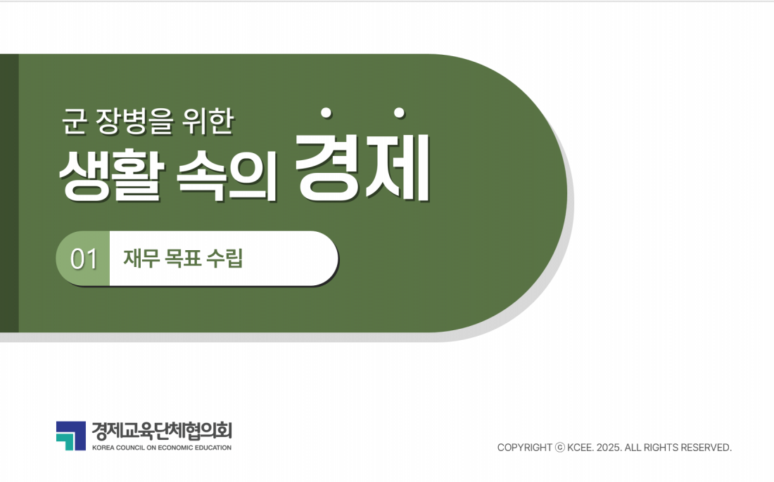 주제별[10분용] 1. 재무 목표 수립 (10분용) 페이지 정보 작성자 최고관리자 댓글 댓글 0건 조회Hit 58회 작성일Date 25-02-27 13:24 본문 교안이 필요하신 분은 경교협 메일(kcee1115@daum.net)로 별도 요청주십시오. 페이스북 공유 트위터 공유 목록 이전글2. 자금 마련 및 재무 상태 점검(2차시) 25.02.27 다음글2. 합리적 소비 (10분용) 25.02.27 댓글 0 댓글목록 등록된 댓글이 없습니다.