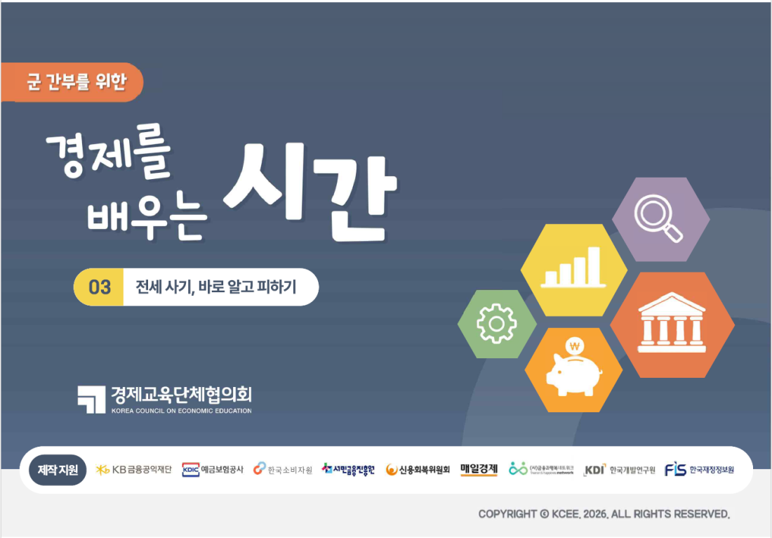 간부용 03. 전세 사기, 바로 알고 피하기 페이지 정보 작성자 최고관리자 댓글 댓글 0건 조회Hit 7회 작성일Date 26-04-08 12:48 본문 교안이 필요하신 분은 경교협 메일(kcee1115@daum.net)로 별도 요청주십시오. 페이스북 공유 트위터 공유 목록 이전글04. AI와 디지털 전환 시대 26.04.08 다음글02. 우리 삶 속의 나라 살림 26.04.08 댓글 0 댓글목록 등록된 댓글이 없습니다.
